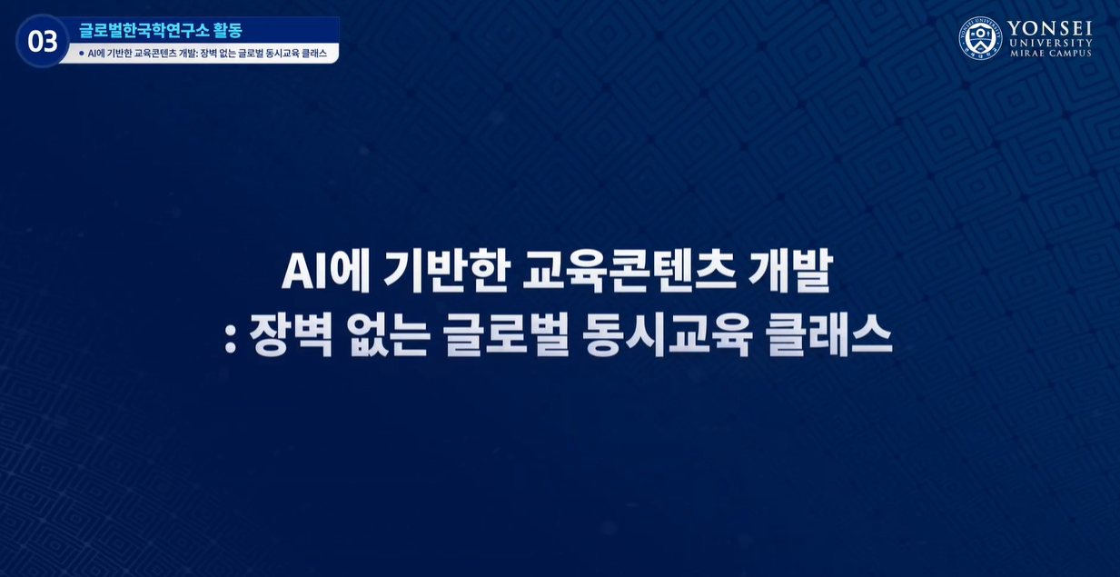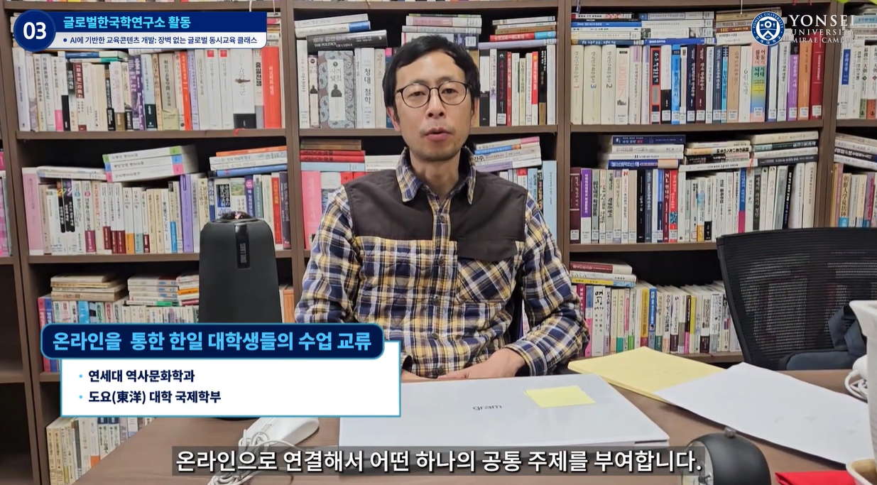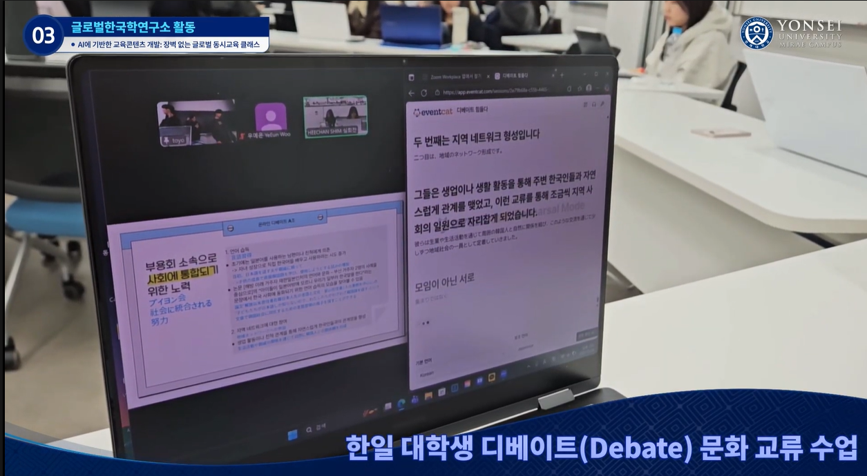 La Escuela de Posgrado de Convergencia Creativa Global de la Universidad Yonsei, en colaboración con la Facultad de Estudios Internacionales de la Universidad Toyo, llevó a cabo un curso de debate en línea como parte de la iniciativa Campus Asia. El curso contó con la participación de estudiantes de Corea y Japón, lo que requirió superar las barreras lingüísticas mientras se mantenía el flujo de la clase y se fomentaba la participación activa.